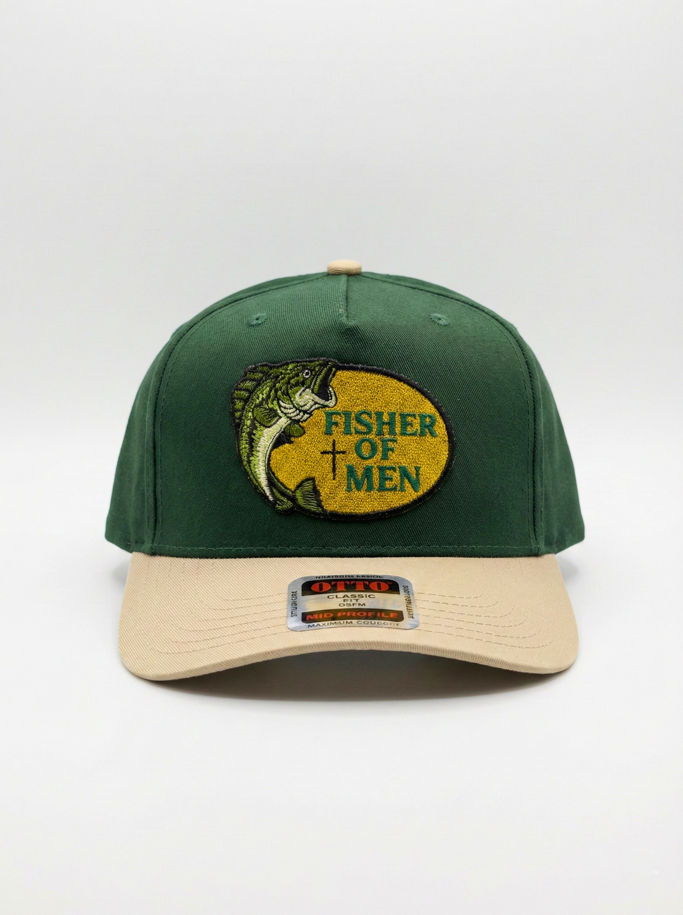 • Design: High-quality "Fisher of Men" woven patch with gold and green embroidery.